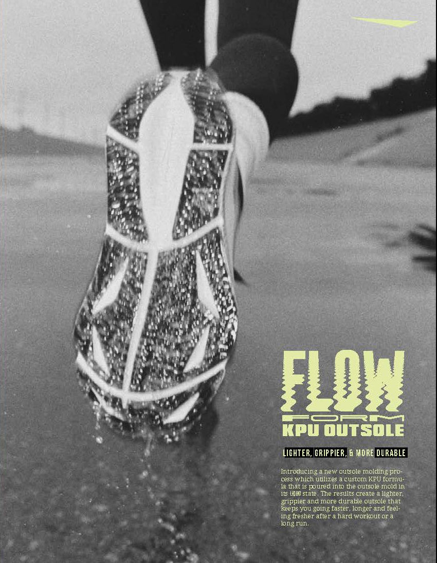 Introducing a new outsole molding processwhich utilizes a custom KPU formulathat is poured into the outsole mold inits LIQUID state. The results create a lighter,grippier and more durable outsole thatkeeps you going faster, longer and feelingfresher after a hard workout or along run.